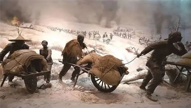 據(jù)不完全統(tǒng)計(jì),淮海戰(zhàn)役中,山東地區(qū)支前民工出動(dòng)88萬輛大小車輛,向前線運(yùn)送原糧兩億多公斤,在惡劣的戰(zhàn)爭環(huán)境和交通條件下,支前大軍用一輛輛小推車將補(bǔ)給源源不斷地運(yùn)往前線。