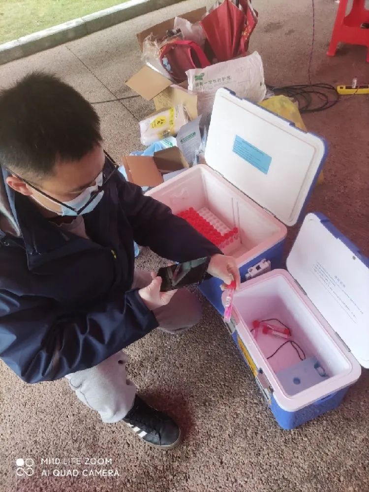 3月21號(hào)在得到社區(qū)的回復(fù)后,我隨即加入了核酸檢測(cè)工作隊(duì)伍,穿上志愿者的防護(hù)服、馬甲、戴上黨徽,哪里工作最苦最累,我就出現(xiàn)在哪里。在檢測(cè)工作中,我主動(dòng)承擔(dān)負(fù)責(zé)打包咽拭子試管工作。首先由醫(yī)護(hù)人員采集咽拭子放入試管中,并轉(zhuǎn)交給我,我再與社區(qū)工作人員一同對(duì)每根試管進(jìn)行掃碼打包,按照采集點(diǎn)分開(kāi)掃碼封箱,在檢查無(wú)誤后交由送檢人員統(tǒng)一送往檢測(cè)點(diǎn),這項(xiàng)工作極考驗(yàn)細(xì)心和耐心,否則就出現(xiàn)錯(cuò)、亂的問(wèn)題。