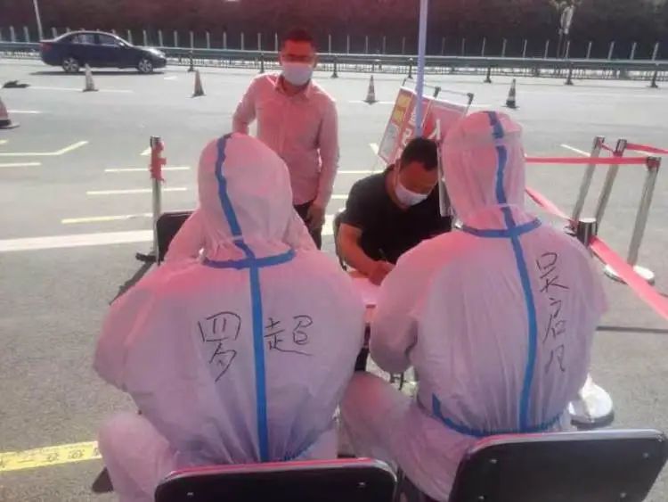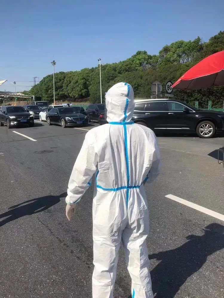 隨著微信群中的消息閃爍,13:53“已到達集合地點”、13:57“已到達集合地點”、13:59“已到達集合地點”、14:00“從進賢出發(fā),正在路上”。大家以最快的速度從各處趕來集結,隨后便在現(xiàn)場工作人員的指導下,熟悉收費口出入政策要求,并“全副武裝”換上了“大白”防疫服。