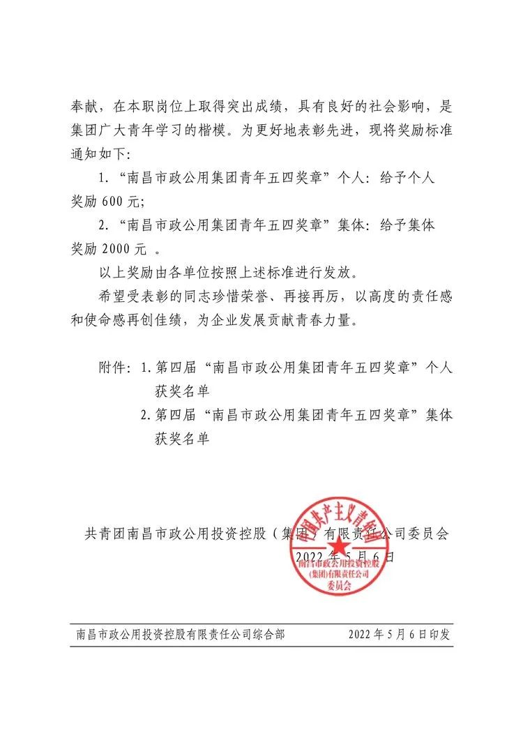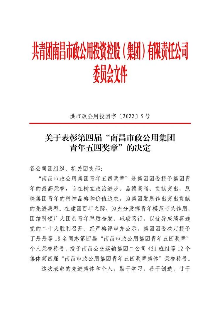近日,共青團南昌市政公用投資控股(集團)有限責任公司委員會發(fā)布了《關于表彰第四屆“南昌市政公用集團青年五四獎章”的決定》和《關于表彰2021年度集團“優(yōu)秀青年志愿者”“優(yōu)秀共青團干部”“五四紅旗團組織”“五四紅旗青年志愿服務隊”的決定》,南昌贛昌砂石有限公司多個集體與個人受到表彰,他們是: