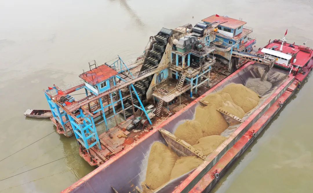 近期,贛撫尾閭綜合整治工程主支樞紐畫眉咀料場內(nèi),贛昌砂石公司采砂施工作業(yè)船只正在加緊生產(chǎn)中。