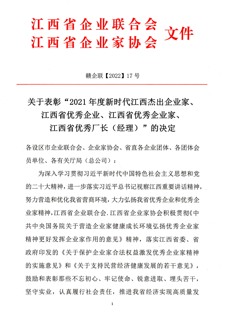 贛昌砂石公司副總經(jīng)理劉捷榮獲“2021年度江西省優(yōu)秀廠長(經(jīng)理)”榮譽稱號。