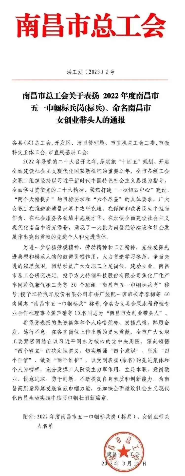 為進一步弘揚勞模精神、勞動精神和工匠精神,充分發(fā)揮先進典型和模范人物的鼓舞引領(lǐng)作用,大力營造學習模范、爭當先進的濃厚氛圍,團結(jié)動員廣大女職工立足崗位、建功立業(yè),近日,南昌市總工會公布的《關(guān)于表彰2022年度南昌市五一巾幗標兵崗(標兵)、命名南昌市女創(chuàng)業(yè)帶頭人的通報》文件,其中來自南昌贛昌砂石有限公司鮑小芳同志喜獲“南昌市五一巾幗標兵”榮譽稱號,表彰了其深耕一線,管內(nèi)務、保生產(chǎn)、促發(fā)展,兢兢業(yè)業(yè)不怕苦的奮斗精神,充分展現(xiàn)了南昌贛昌砂石有限公司‘婦女能頂半邊天’的巾幗風采。