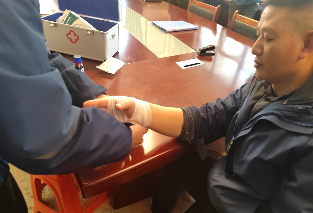 演練現(xiàn)場(chǎng),重點(diǎn)項(xiàng)目部副部長(zhǎng)孔結(jié)前組織大家學(xué)習(xí)觀看了外傷急救應(yīng)急視頻,接著,詳細(xì)講解了多種止血、包扎方法,其中重點(diǎn)對(duì)指壓止血法、止血帶止血法和繃帶包扎、三角巾包扎方法進(jìn)行講述。隨后,組織現(xiàn)場(chǎng)人員模擬船上作業(yè)不慎被機(jī)械創(chuàng)傷并進(jìn)行外傷急救演練。