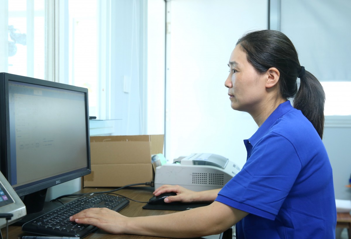 在磅房中,窗口吹進(jìn)的熱浪一陣又一陣,但是發(fā)貨員蔡文娟的臉上也并未出現(xiàn)一絲疲態(tài)的痕跡正在認(rèn)真做著運(yùn)輸車輛出場前的稱重打榜工作。