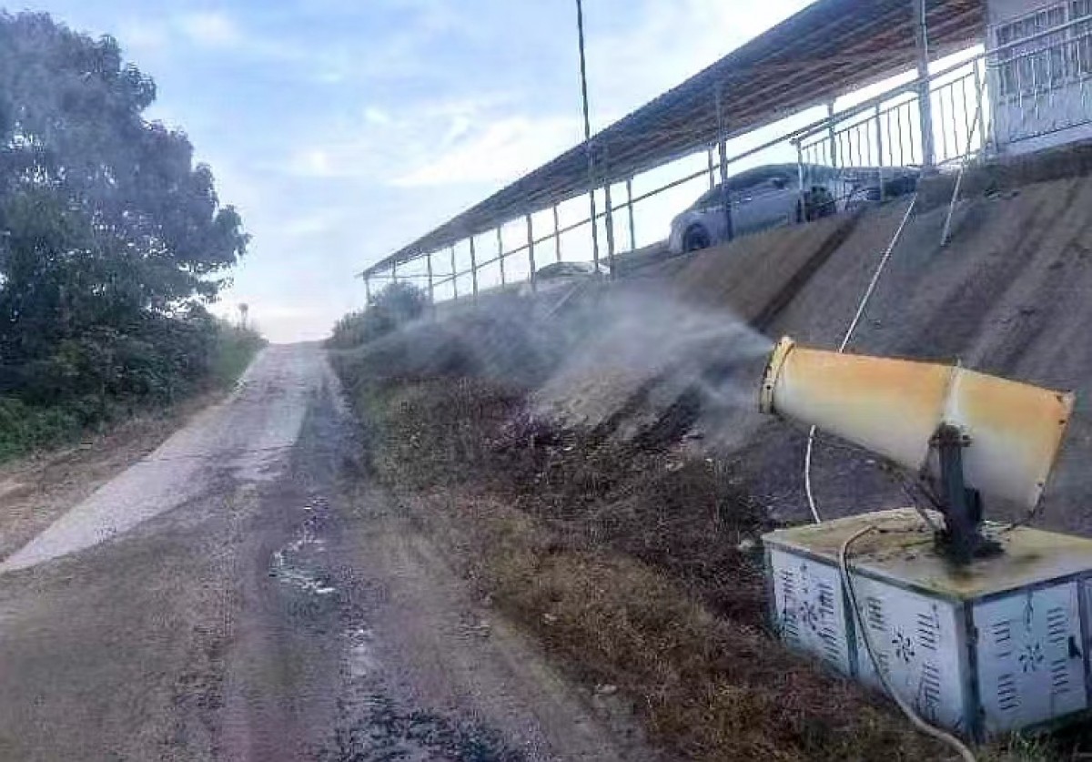 在無條件配備灑水車、噴淋設(shè)備的砂場(chǎng)安裝霧炮機(jī),分早、中、晚三個(gè)時(shí)間段對(duì)砂場(chǎng)進(jìn)出口道路噴灑,場(chǎng)內(nèi)作業(yè)區(qū)域采用人工灑水降塵,天氣干燥炎熱或風(fēng)力較大時(shí),靈活增加噴灑頻次。