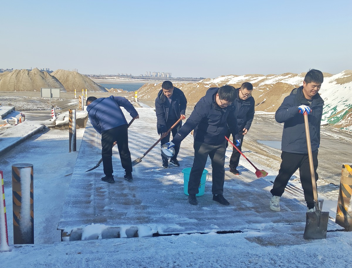 風(fēng)雪中,一雙手套、一件沖鋒衣、一把鐵鍬,砂場職工又開始了一天忙碌的工作,他們在砂場來回穿梭檢查設(shè)備安全、排查安全隱患,清理主要道路、地磅設(shè)備上的積雪,鋪設(shè)草墊及工業(yè)鹽,防止路面打滑,確保車輛安全通行。空曠的砂場上沒有遮擋物,寒風(fēng)裹挾著沙,直往員工的衣袖里鉆,手凍得直哆嗦,他們沒有一絲抱怨。