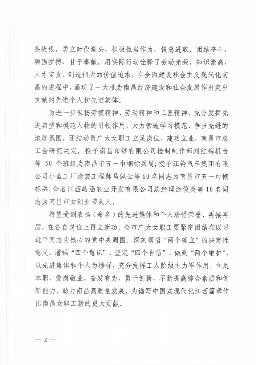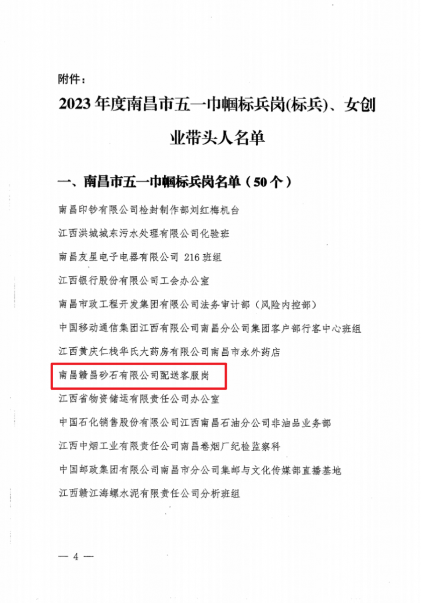 近日,南昌市總工會印發(fā)《南昌市總工會關(guān)于表揚2023年度南昌市五一巾幗標兵崗(標兵)、命名南昌市女創(chuàng)業(yè)帶頭人的通報》,其中,贛昌砂石公司配送客服崗獲得“南昌市五一巾幗標兵崗”榮譽稱號!