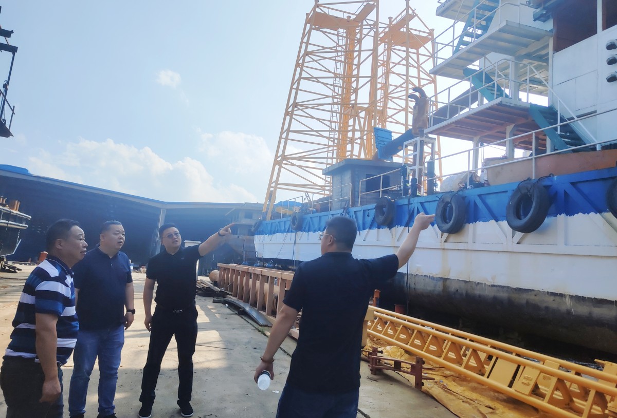 會后,蔡安煜一行前往湖南桃花江游艇制造有限公司船廠對該公司建造的采砂船舶進行實地參觀考察。
